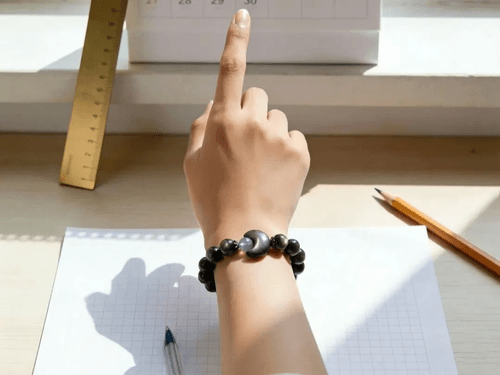 「是否曾在夜晚渴望那一道能夠交織穩定與夢幻的光影?這條手串用茶晶、金曜石與銀曜石月亮,搭配拉長石的藍色光暈,彷彿把月光輕柔地編織在你手腕上,讓心境在靜謐中散發無限能量。」