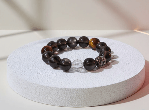 《御財霸者》結合吞金獸(貔貅)、金曜石、銀曜石、紅虎眼、黃虎眼、茶晶六大強勢能量寶石,象徵無懼的領袖氣場、堅不可摧的財富磁場與無窮的行動力,助你在事業、財富與人生道路上披荊斬棘,登峰造極!