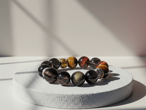 《金鋒霸業》融合紅虎眼、黃虎眼、茶晶、六字箴言轉輪珠、吞金獸(貔貅)、金曜石六大強勢能量寶石,代表無畏的領袖氣場、銳利的行動決斷力與堅不可摧的財富守護,助你在人生與事業道路上所向披靡,成就非凡霸業!