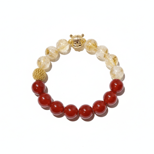 「是不是也想在忙碌中點燃那股熱情?這條手串以奶蓋黃水晶、紅瑪瑙,再搭配哪吒飾品,彷彿讓傳說中的火焰在你手腕上燃起,帶來旺盛財運和無懼力量!」