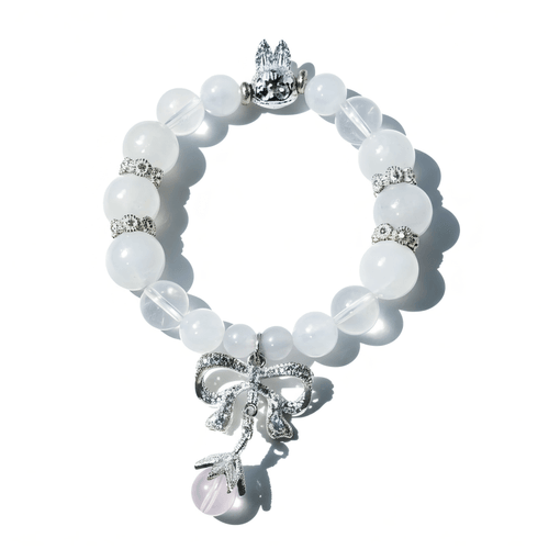 「你是不是也想讓流行與甜蜜在手腕間悄悄綻放?這條手串以莫桑粉晶、藍暈月光石、芙蓉粉晶搭配蝴蝶結墜飾,再點綴LABUBU飾品,讓你的每個動作都散發出無限甜美魅力!」