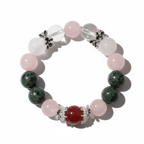 草莓晶、粉晶家族與滿景綠幽靈、雪花白幽靈交織,讓愛與療癒、活力與純淨一次到位,舉手投足都散發春日般的柔美光暈。