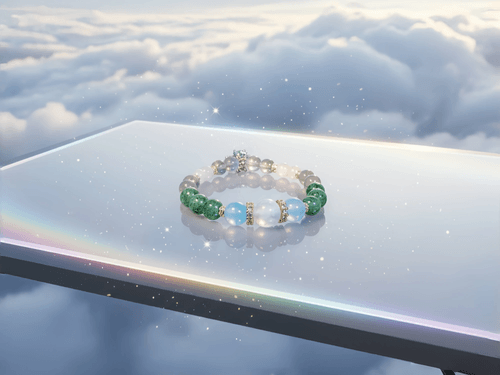 「有沒有那種感覺,就像進入了奇幻仙境?這條手串融合藍暈月光、天河石、綠草莓晶、拉長石、芙蓉粉晶,再搭配獨特藍鋯石墜飾,彷彿帶你走進愛麗絲夢遊仙境,感受夢幻與現實交織的柔美能量!」