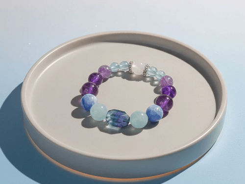 《深海呢喃》融合綠螢石、海藍寶、藍晶石、烏拉圭紫水晶、紫祖母晶、藍螢石、透石膏七大靈性寶石,象徵心靈的澄澈、智慧的開啟與療癒的深度,助你釋放壓力、開啟直覺力,在人生的大海中自在航行,找到真正的自我與方向。