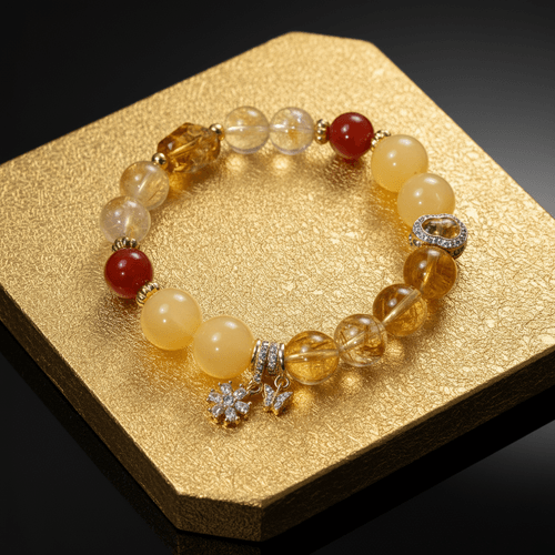 「覺得生活中總缺點黃金祝福嗎?這條手串融合黃塔山水晶、黃蜜蠟、奶蓋黃水晶與紅瑪瑙,再搭配葫蘆金飾與蝴蝶&花墜飾,猶如把滿滿好運與溫暖祝福,都戴在手上,讓幸福從指尖開始起舞!」