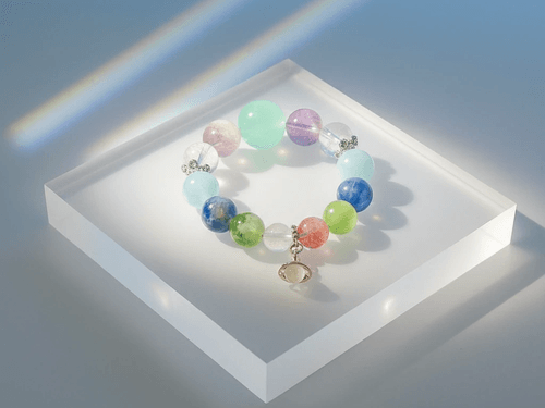 《繽紛幻境》融合綠螢石、紫幽靈、白水晶、海藍寶石、藍晶石、岫玉青提奶蓋、草莓晶、粉晶石八種夢幻寶石,猶如調色盤般繽紛多彩,象徵人生的豐富、活力與無限可能。讓你的生活充滿色彩,擁抱每一刻的美好與驚喜!