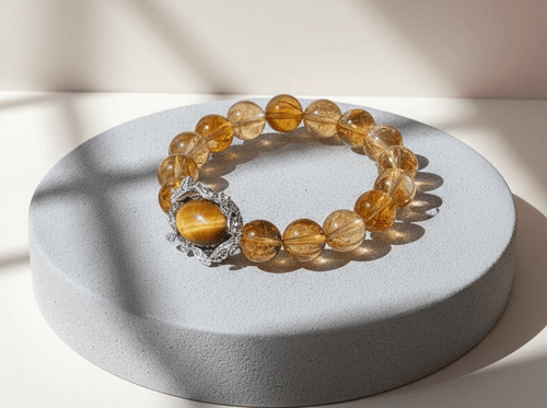 「覺得生活裡總缺那股金光閃閃的能量嗎?這條手串以黃塔山水晶和黃虎眼魔方完美搭配,展現簡約卻不簡單的黃金美感,彷彿將財運和祝福鎖定在手腕上!」
